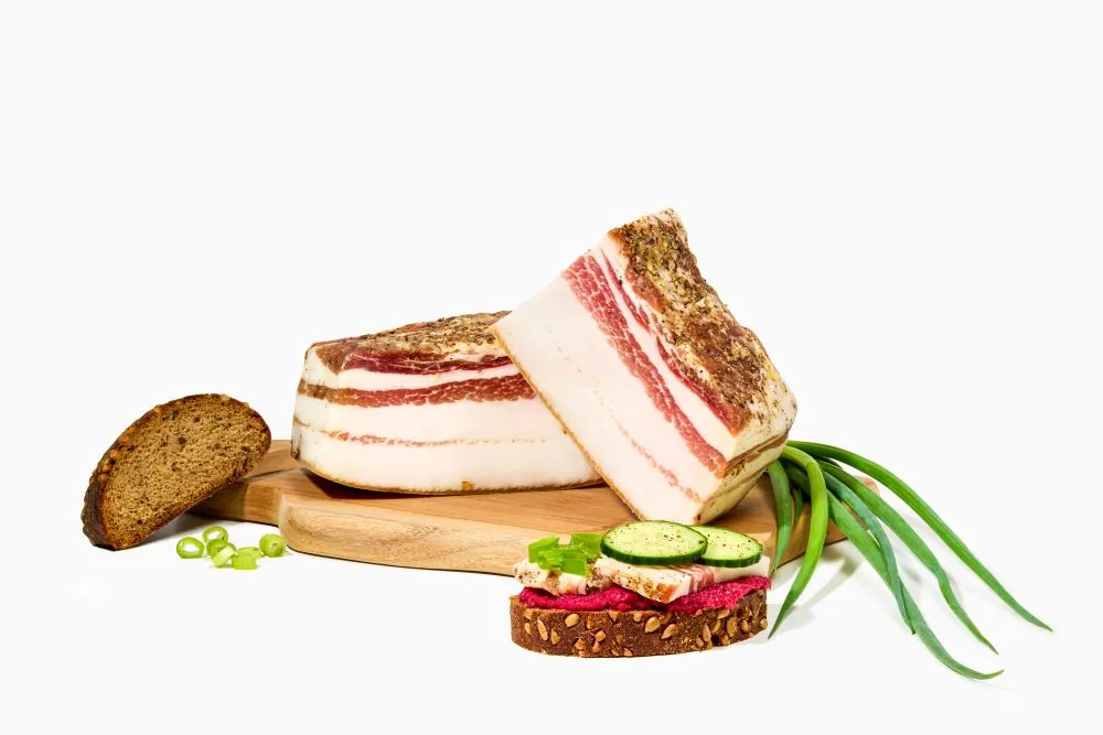 Jedna z najpopularniejszych słonin na Litwie, prawdziwe dziedzictwo narodowe. Tradycyjnie solona, o wyrazistym smaku, idealna do kanapek, smażenia lub gotowania. Autentyczny, klasyczny produkt, który łączy pokolenia. Najlepiej smakuje z ciemnym chlebem i cebulką.